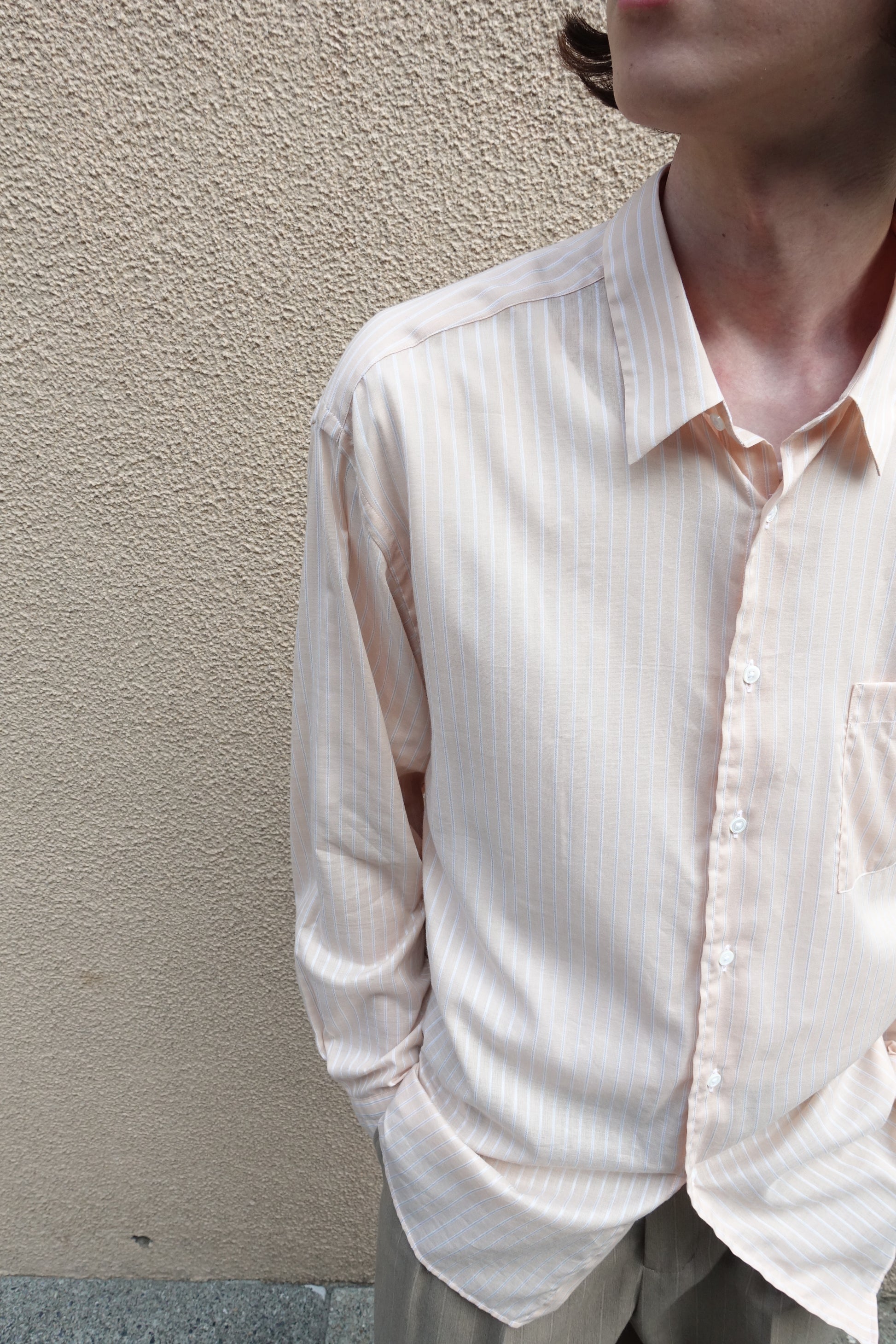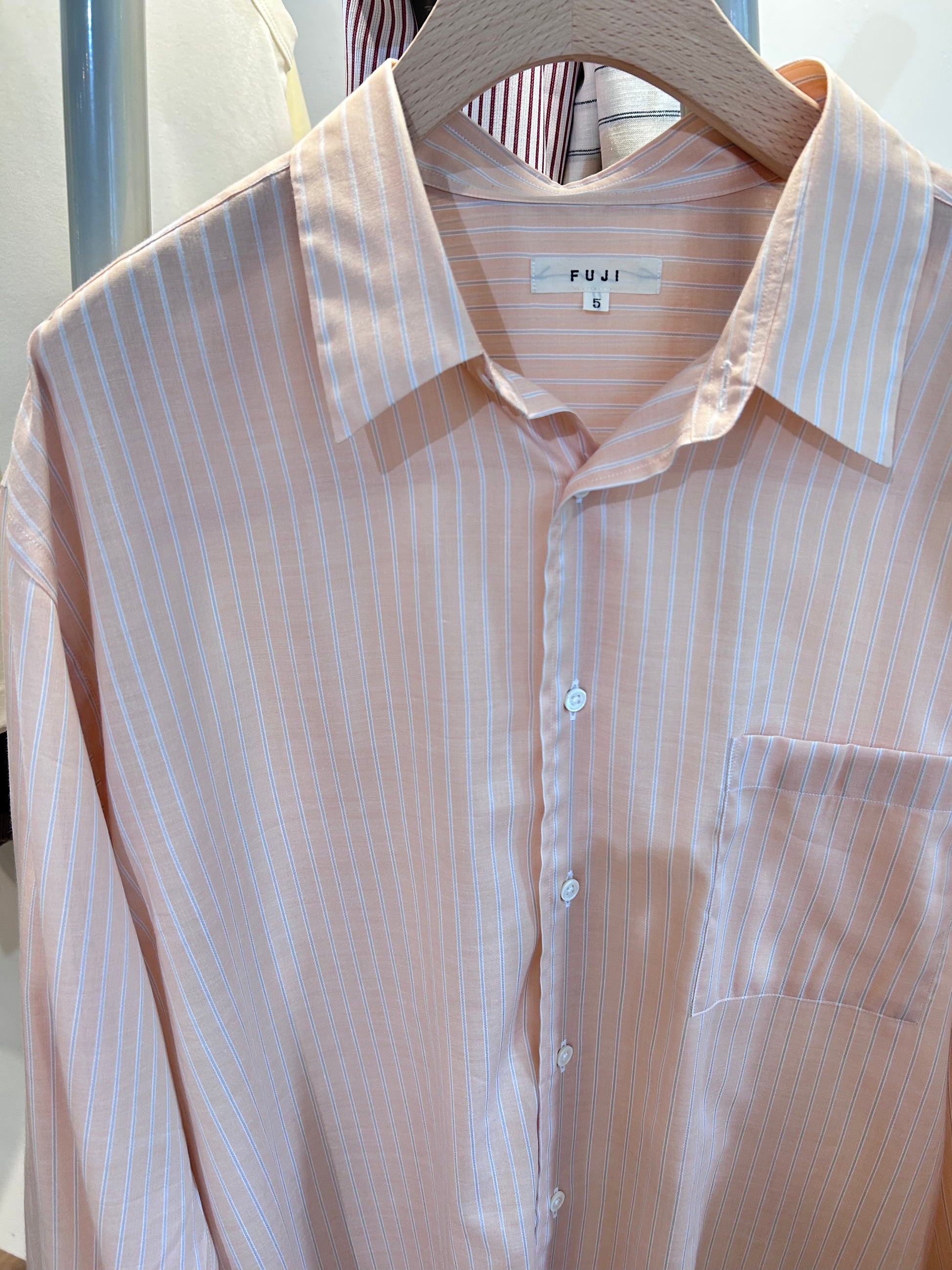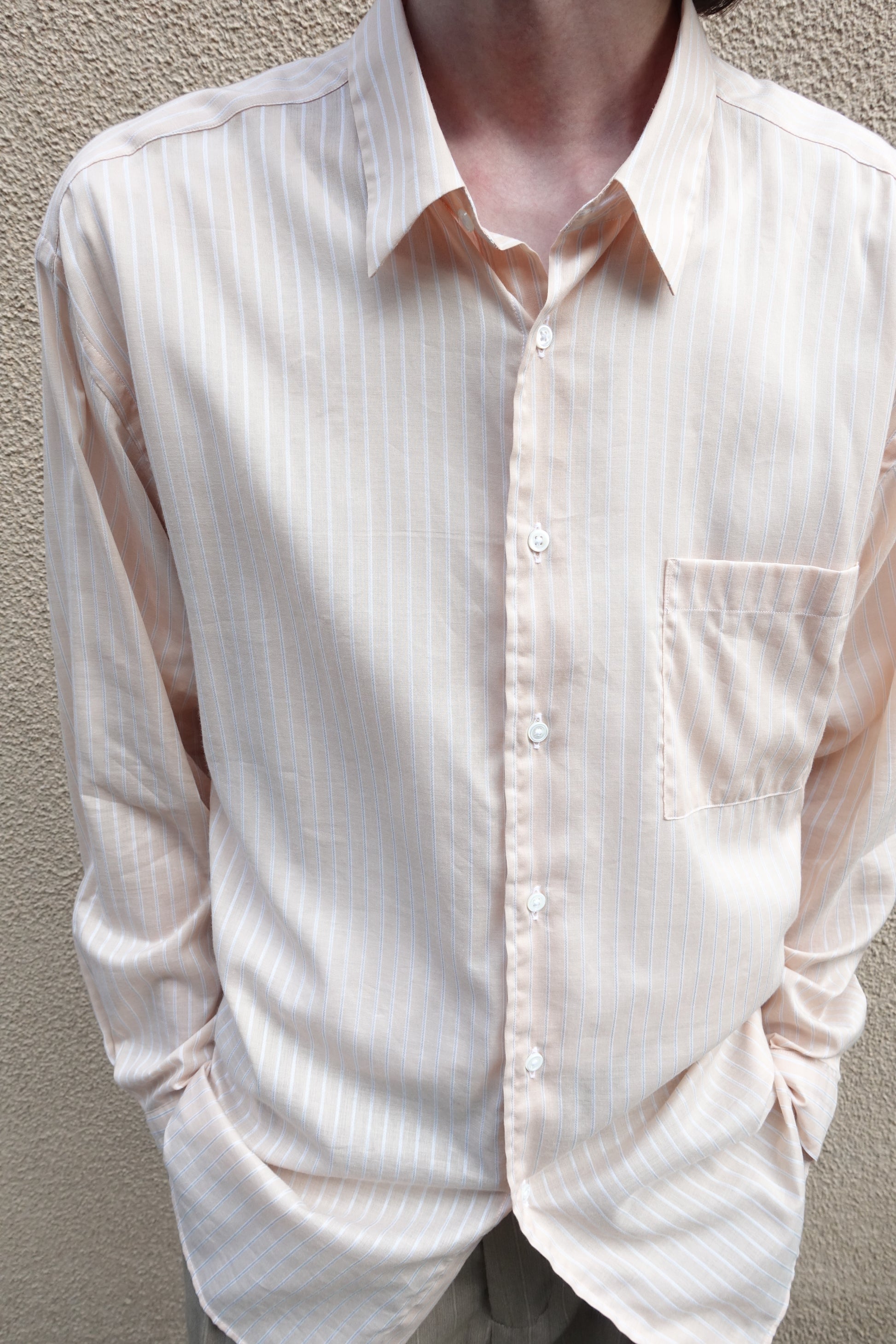 エアータンブラー加工を施し、ふっくらした風合いに仕上げたキュプラ混の上品なドビーストライプシャツ。優しい色合いとうっすら透けるシアー感が特徴。2色3サイズ展開。