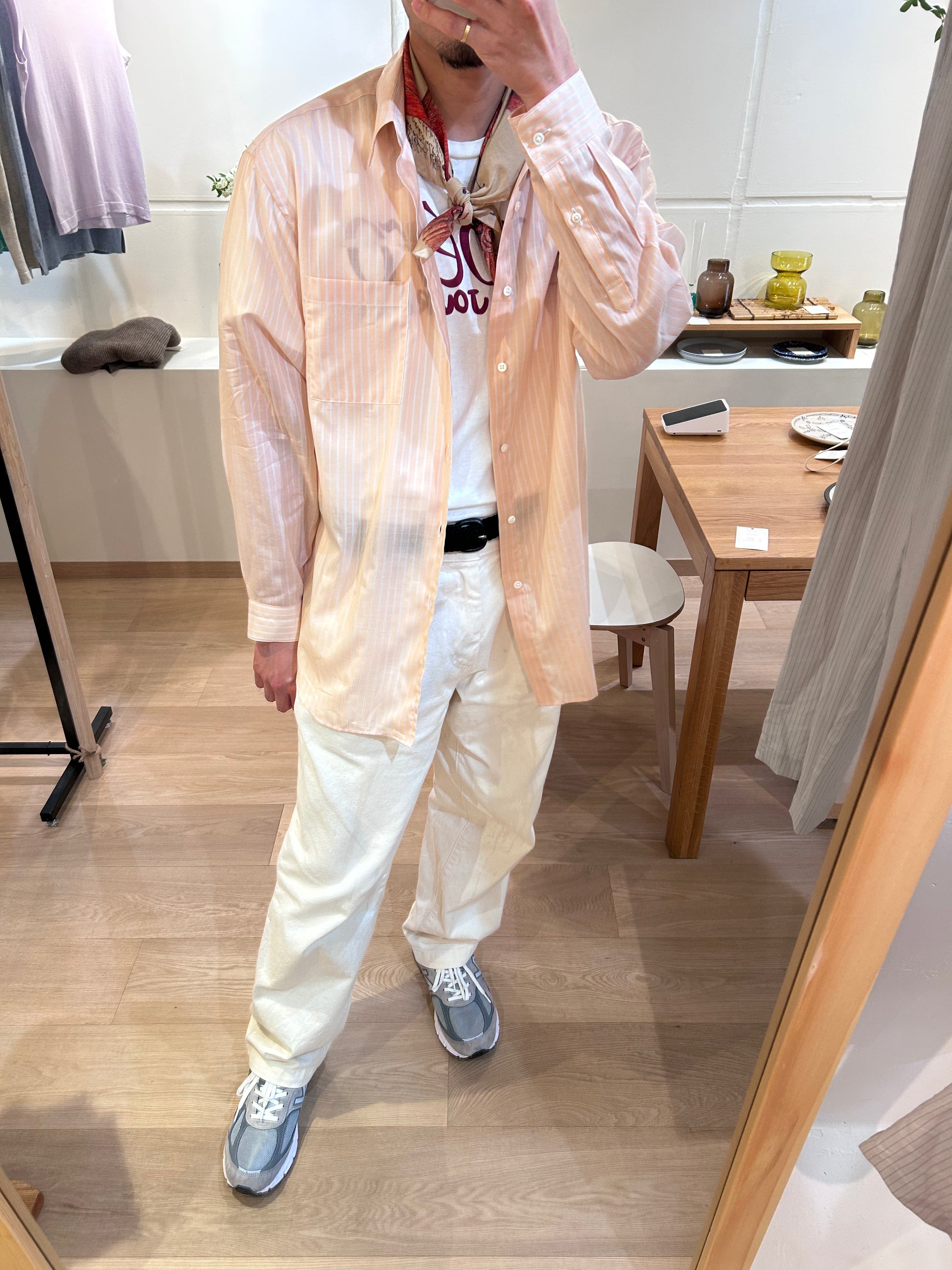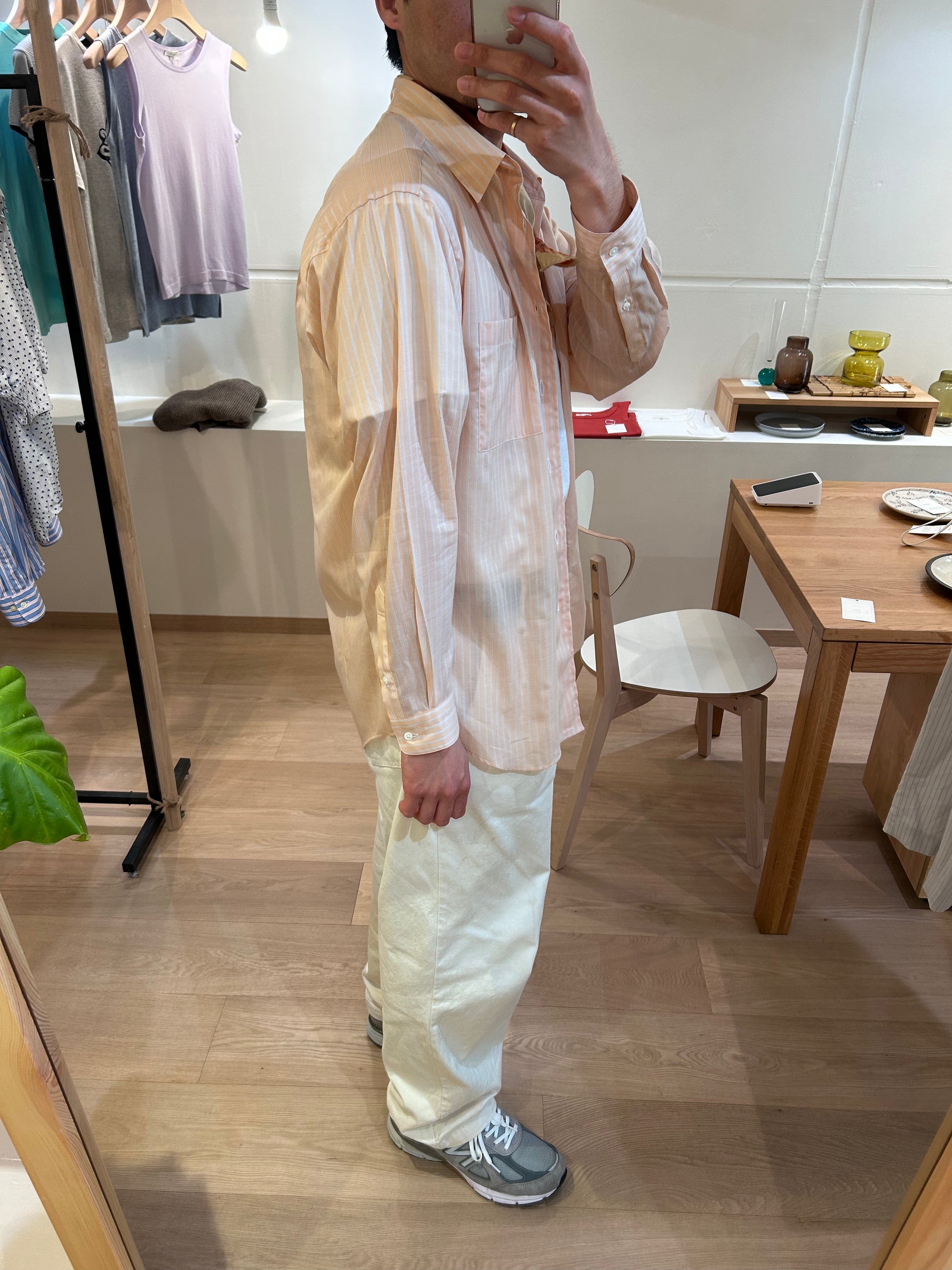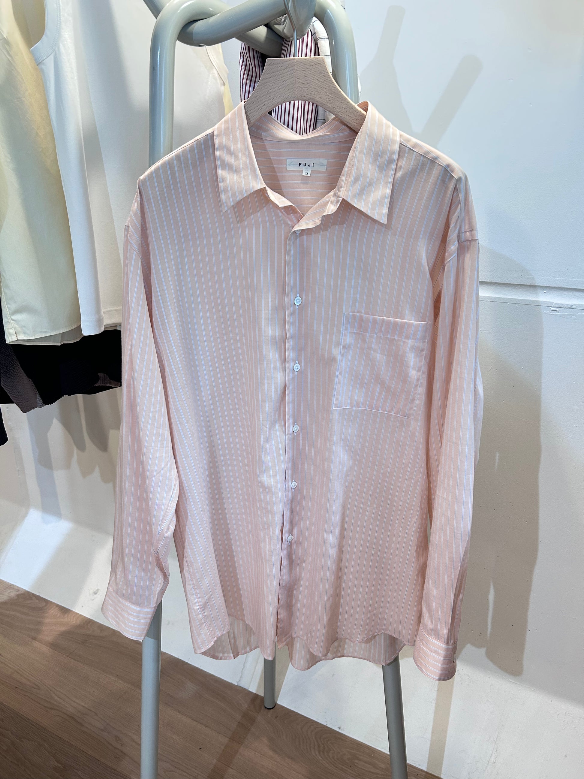 エアータンブラー加工を施し、ふっくらした風合いに仕上げたキュプラ混の上品なドビーストライプシャツ。優しい色合いとうっすら透けるシアー感が特徴。2色3サイズ展開。