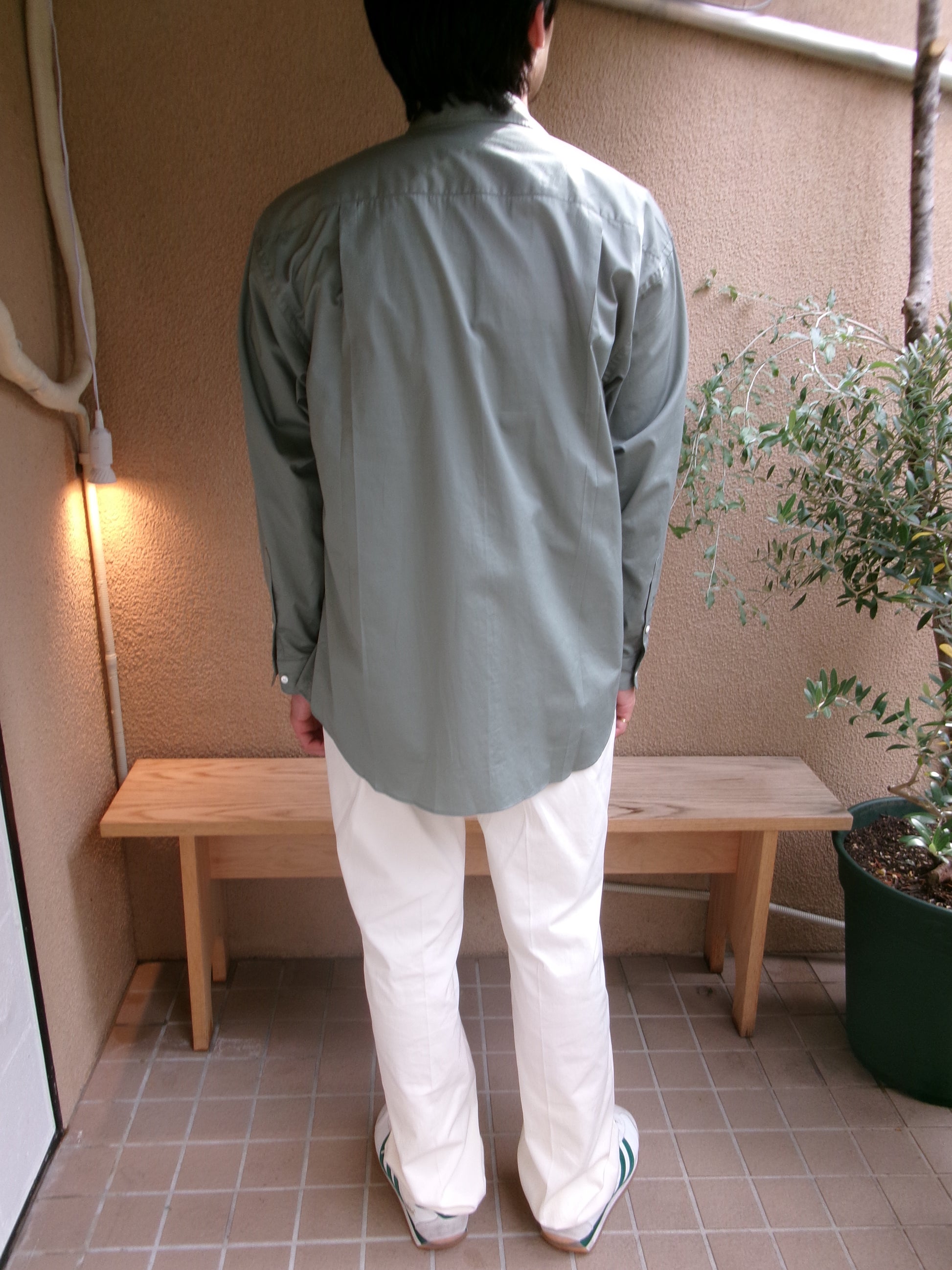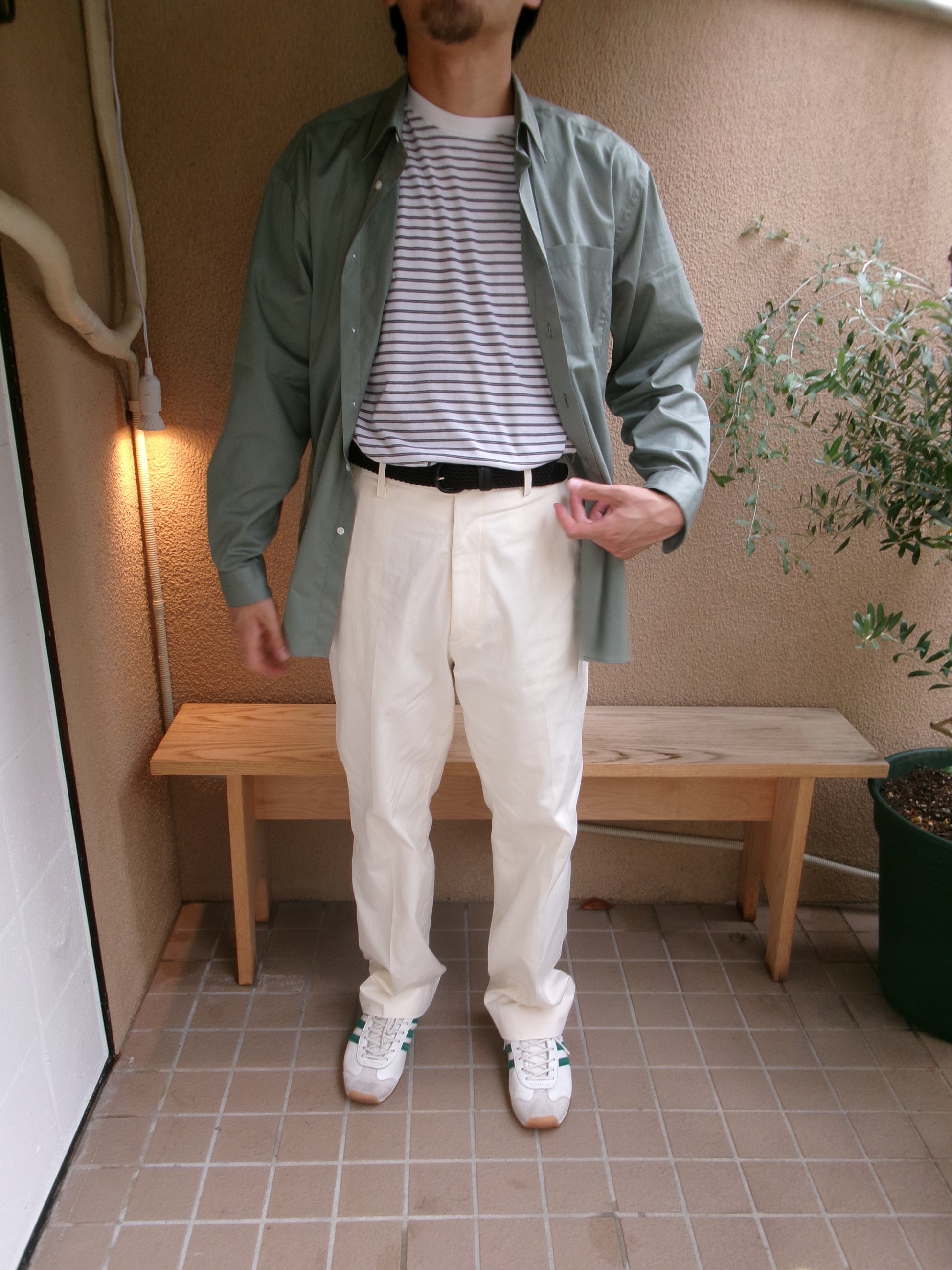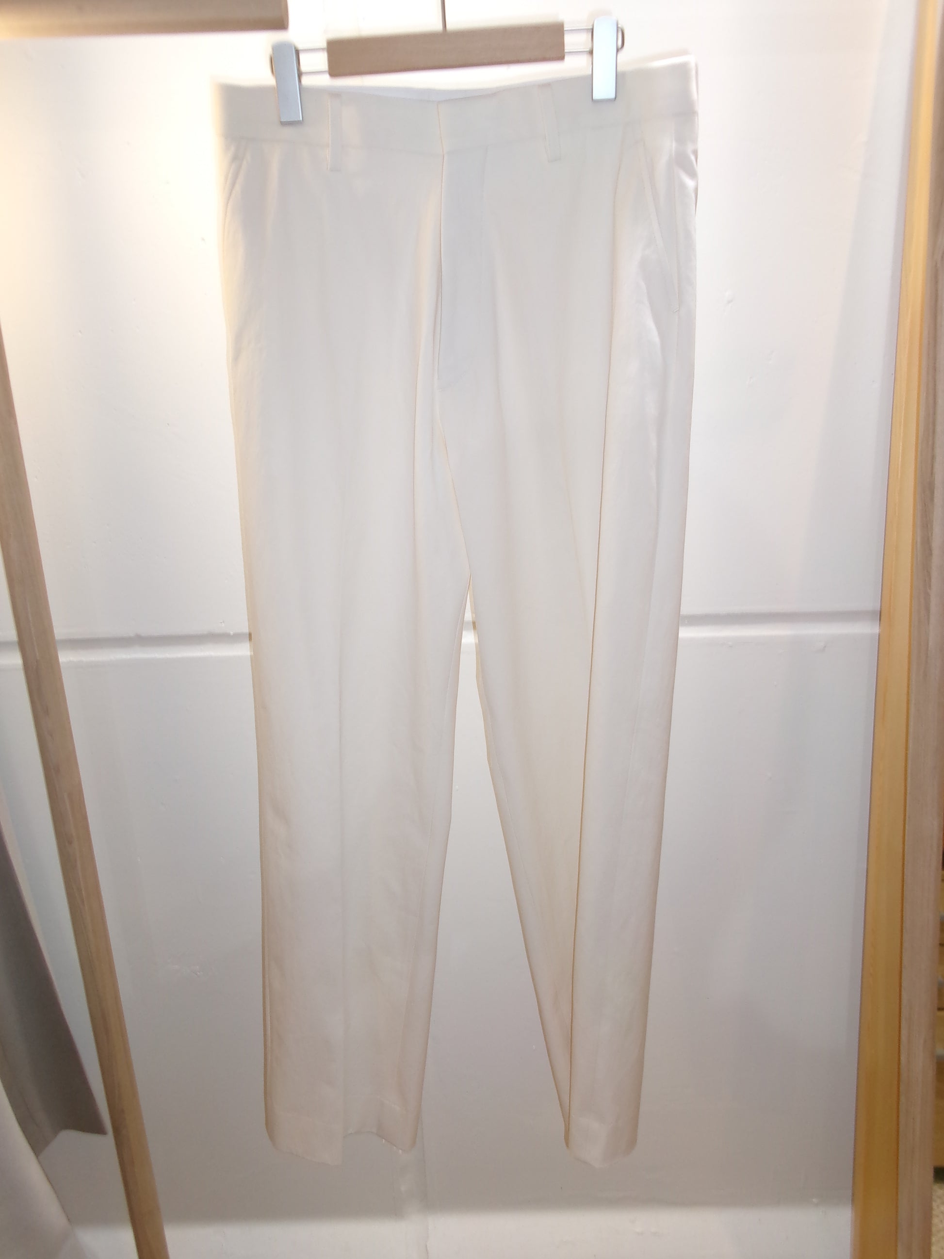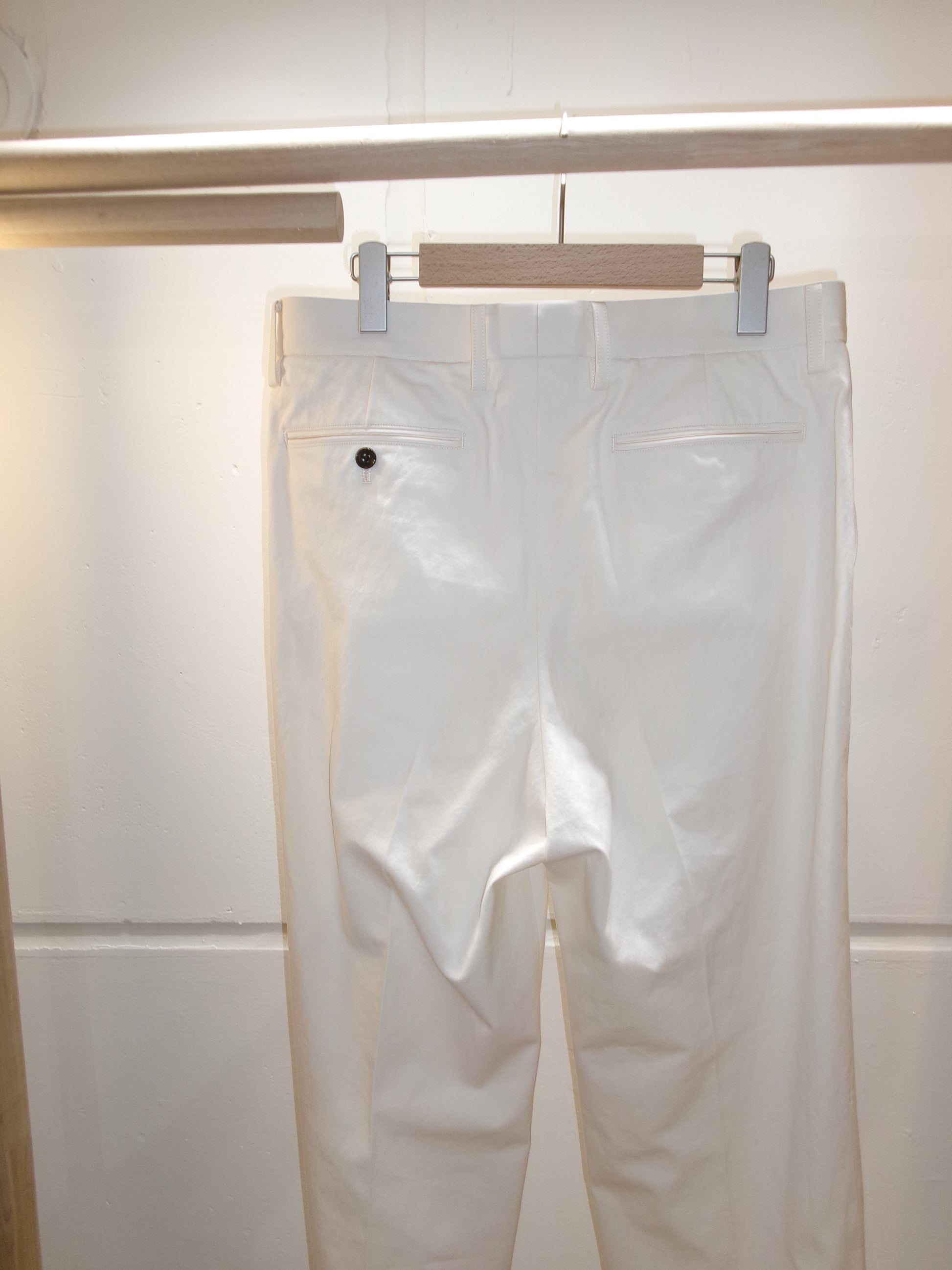 オーガニックコットンのギャバジン素材を使用したノータックスラックス。 高密度に織り上げた強撚糸による、生地の締まりと清涼感に加え、 近江晒加工を施すことで、ヴィンテージ感と膨らみのある風合いが特徴です。 マーベルト仕様、両玉縁ポケットとクラシカルに仕上げています。 本水牛ボタン、エクセラファスナーを使用。