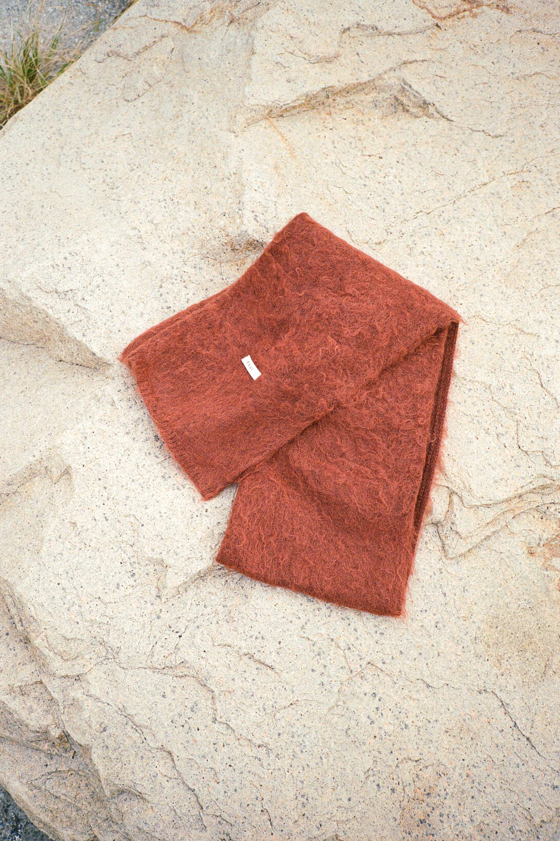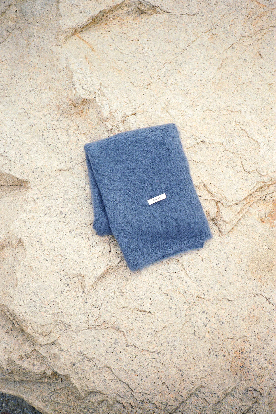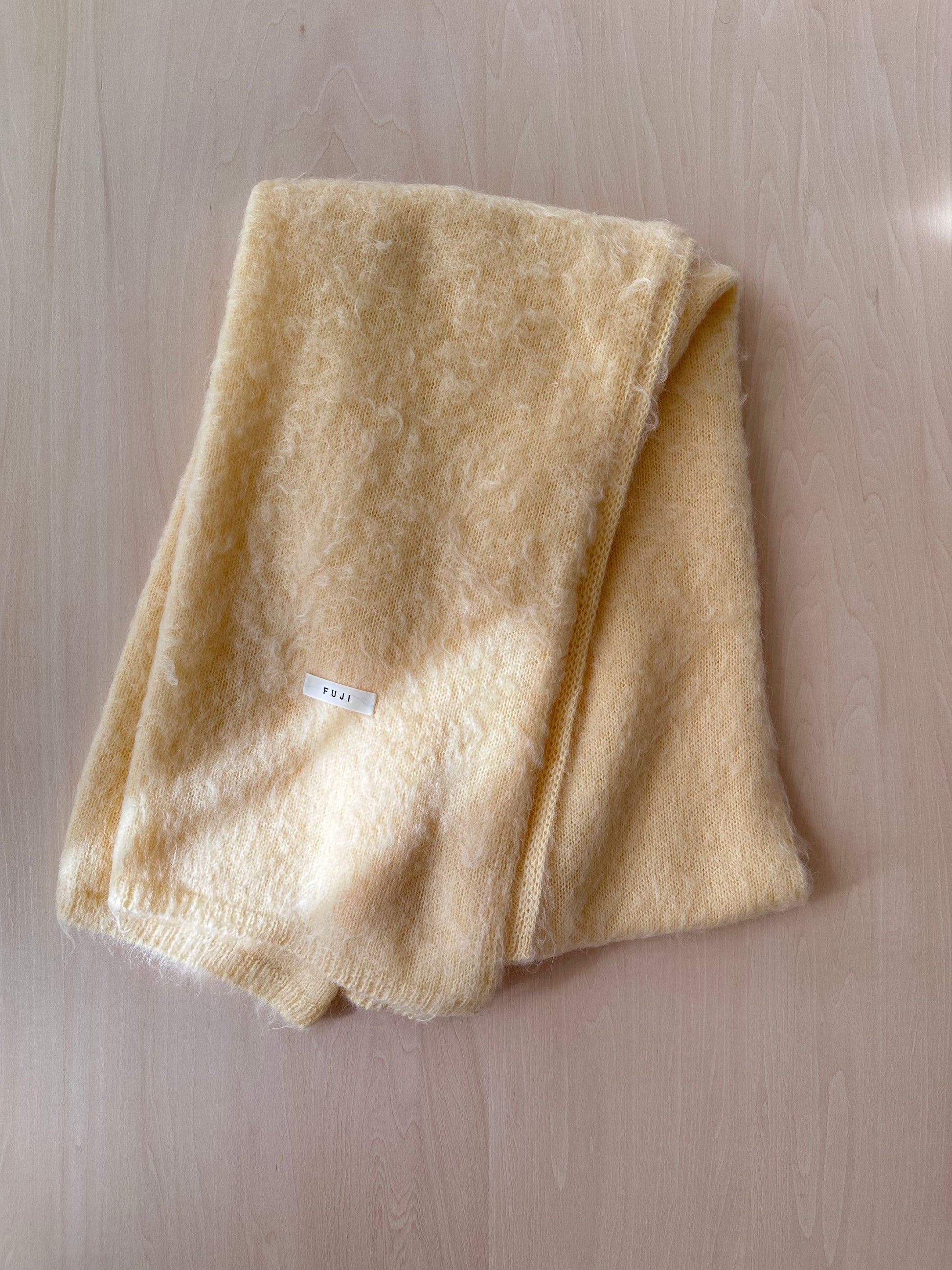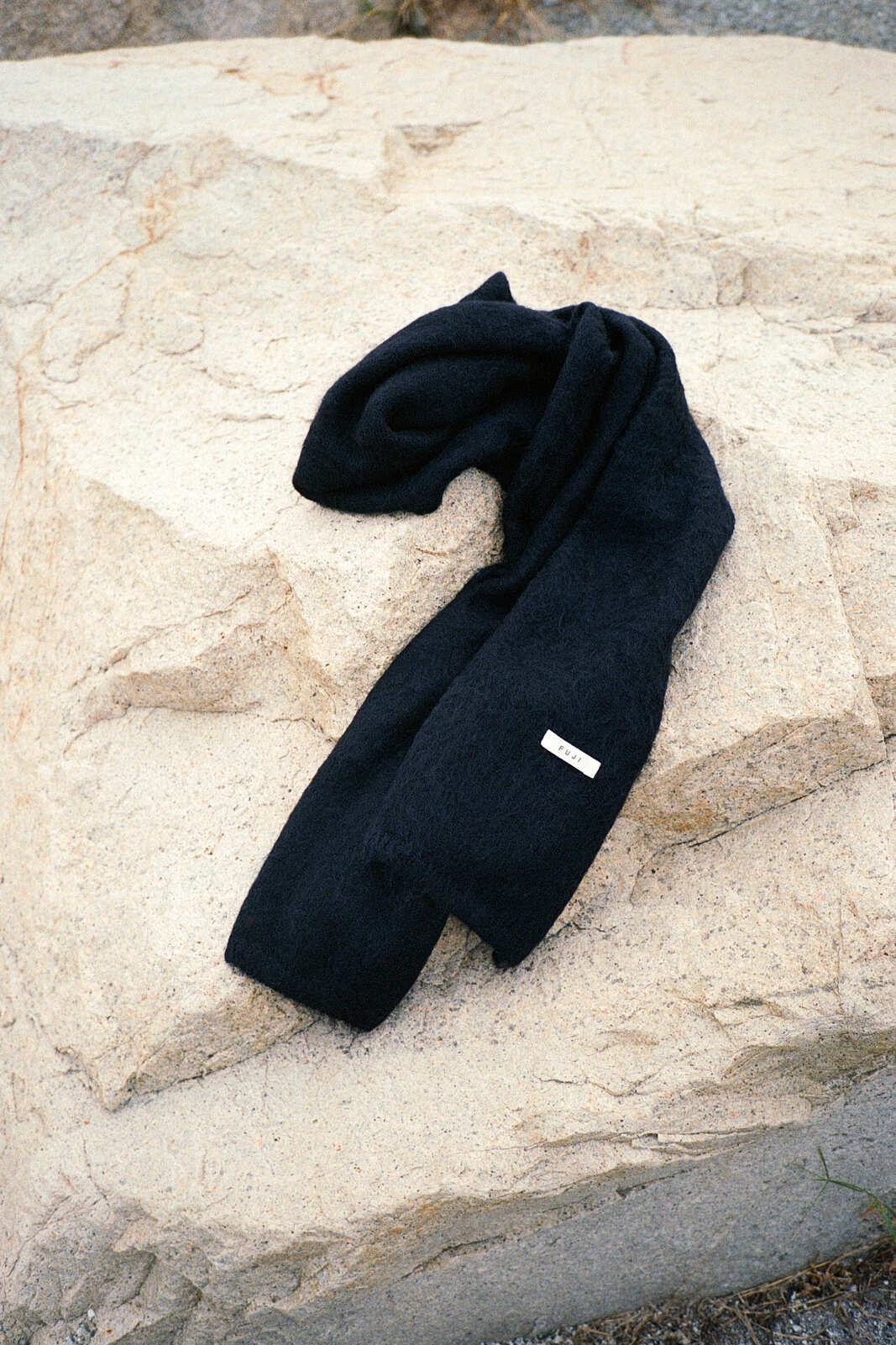 キッドモヘアをベースに編み立てた大判のマフラー 編み立てた編み地を職人が1本1本丁寧に毛羽たたせ、表面にウォッシュ加工を入れたことによって、天然パーマのようなクルクルとした表情を生み、上質で上品な繊維、柔らかな風合いのロングマフラー。