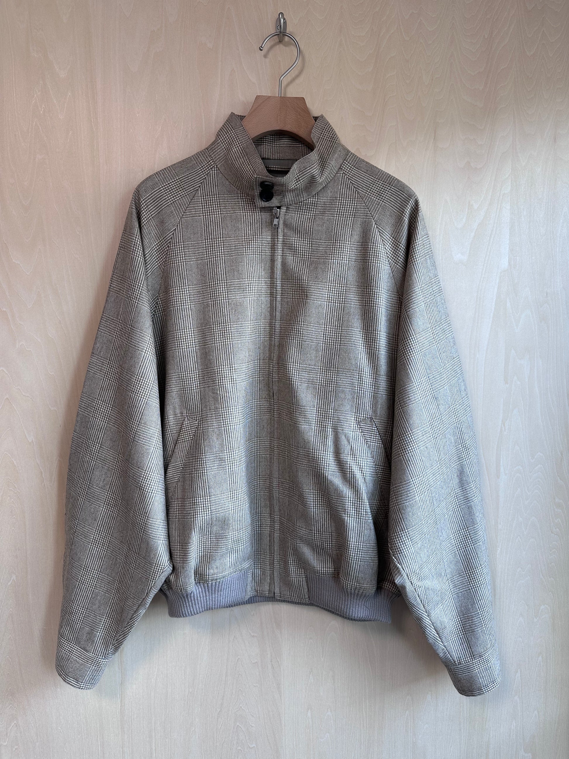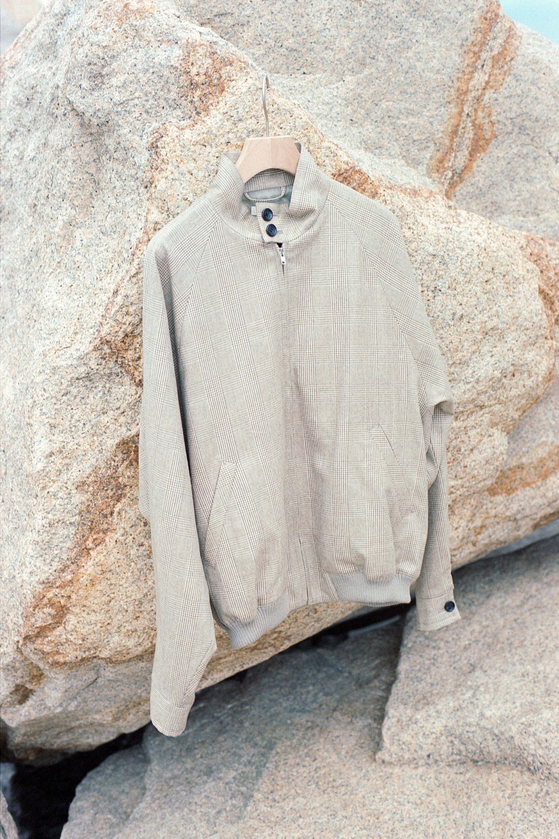 ウールに樹脂加工をすることで、しわになりにくさと家庭洗濯を可能にした素材を使用した、グレンチェックのラグランスタンドカラージャケット。袖のボタンを切り替えることでタック感を表現することもできます