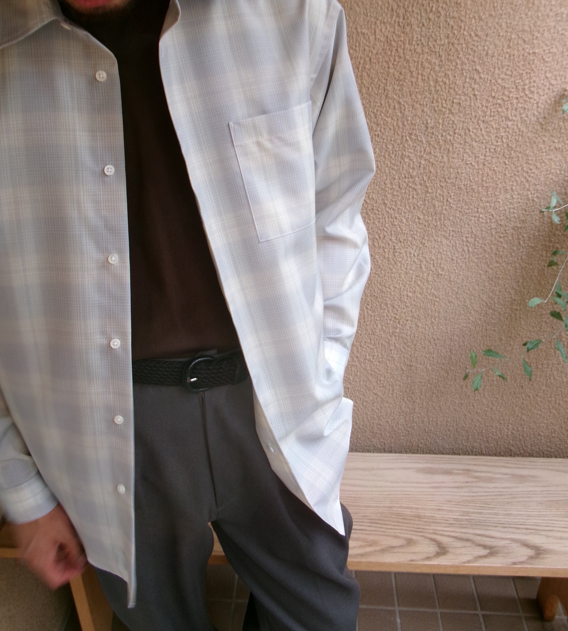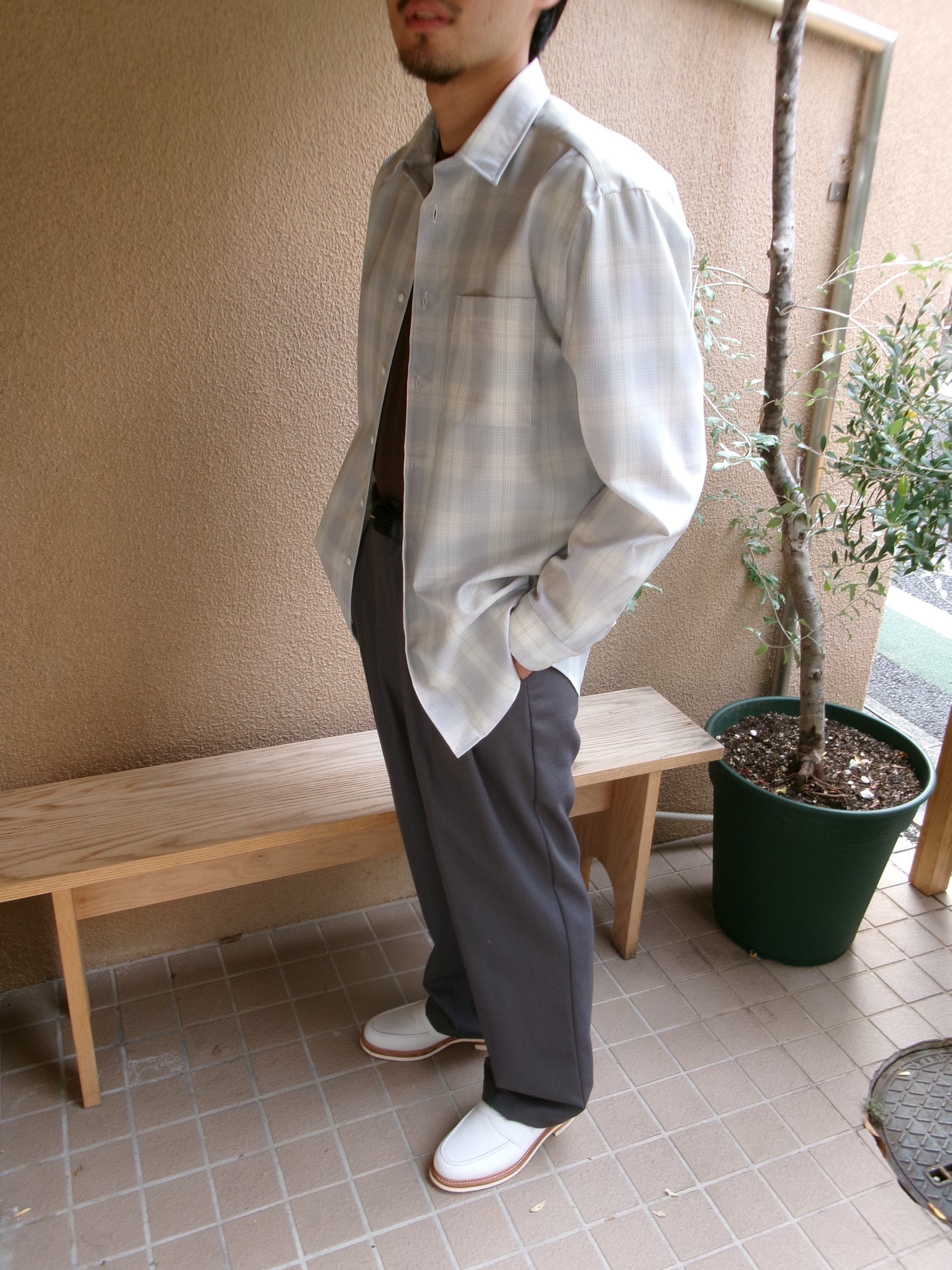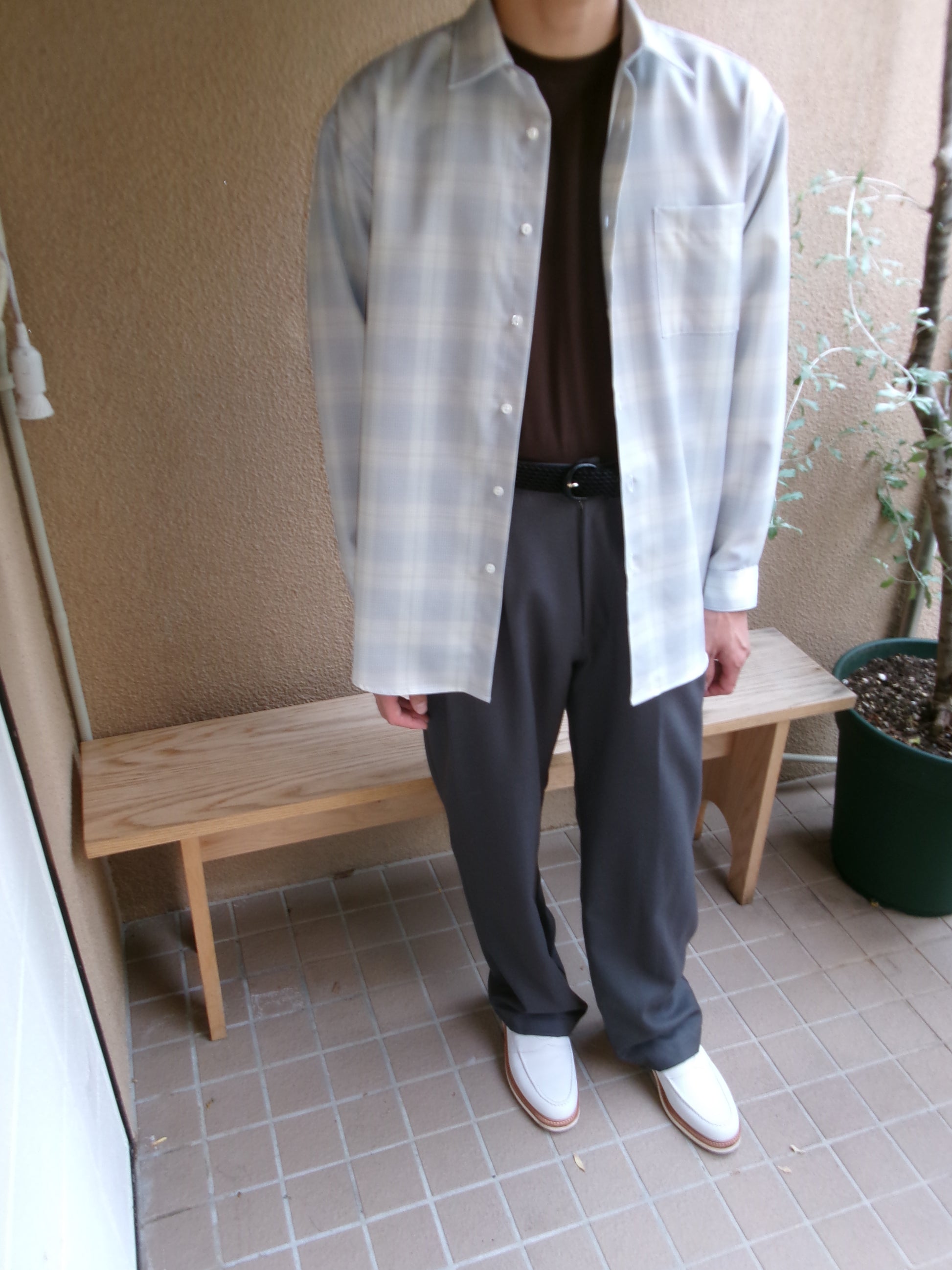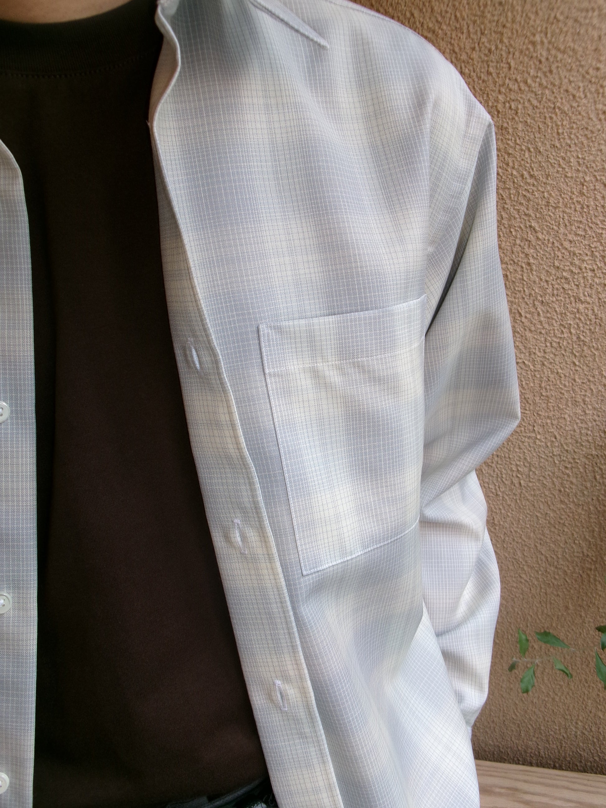 デッドストックのウールチェック生地を使用したウールチェックシャツ。 ウールのハリ感とコシのある風合いで軽やかさが特徴。清涼感のあるチェック。 リラックスシルエット、3cm 間で 21 針の丁寧な仕立てです。